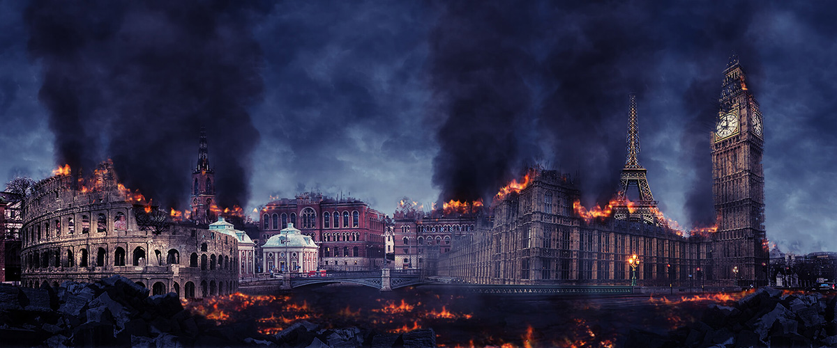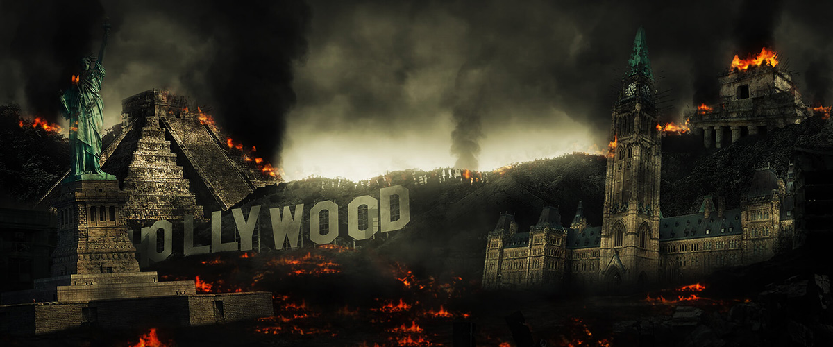Landmarks from North America were used to represent the North American team. I used billowing black smoke and damaged structures.