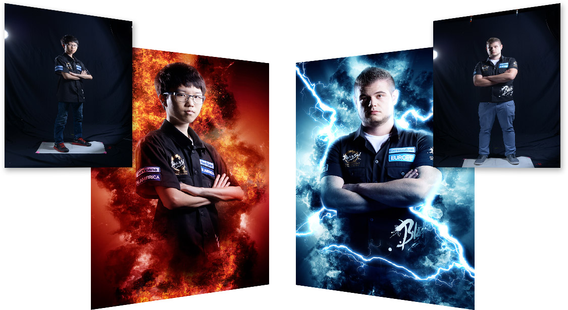 Currently the NA and EU teams are separated by the color red (NA) and blue (EU). Instead of sticking to the colors, I decided to use the elements fire and lightning instead. That way, the audience are still able to identify the teams as the colors are still intact but the fire and lightning gives a more dramatic treatment.
