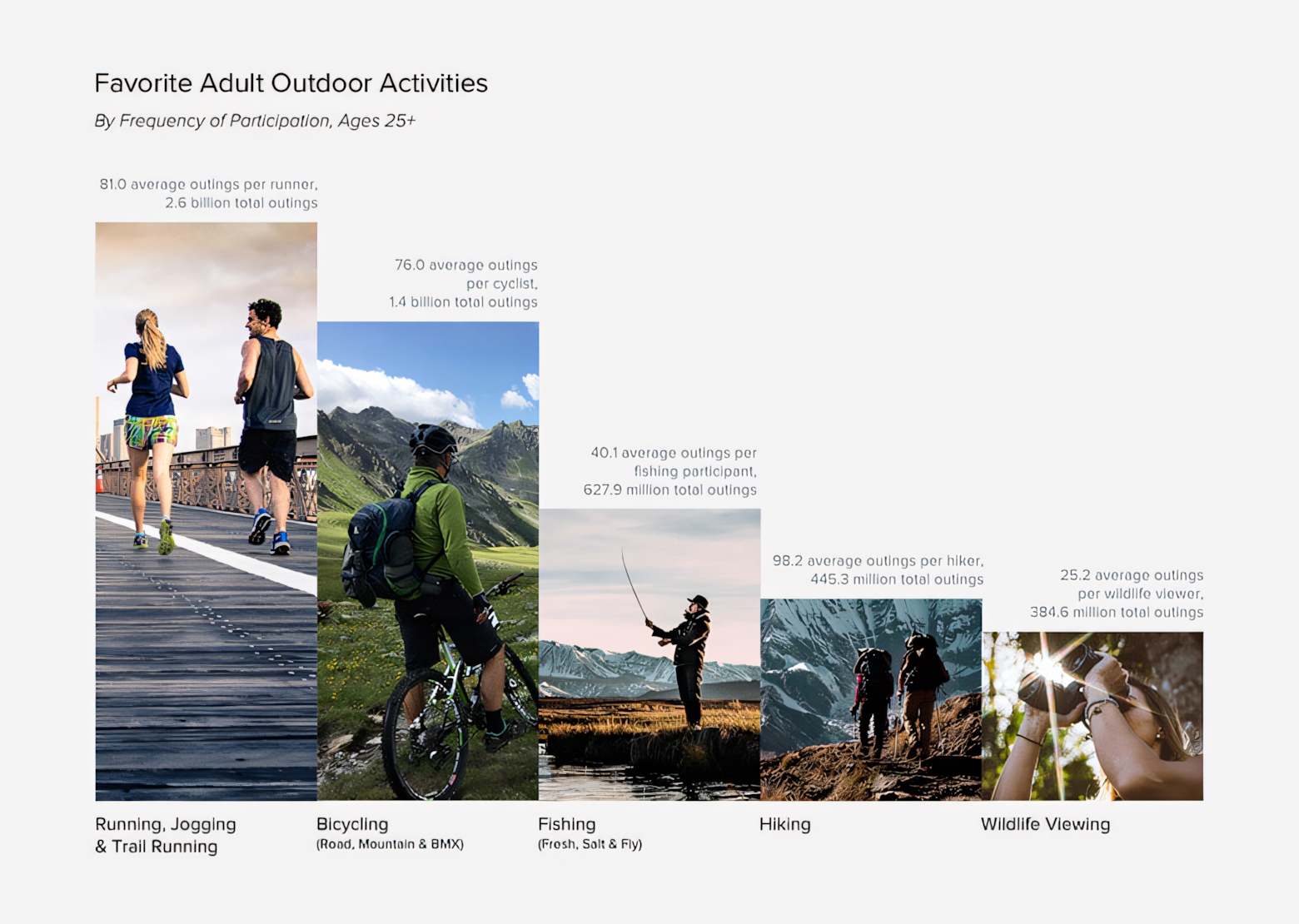 · Running/jogging, fishing, hiking, cycling and camping are most popular outdoor activity among adults age 25-45+