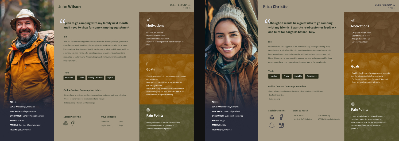 With the research I have gathered above I can finally narrow down to 2 initial user personas that represent the potential customer demographic. I did further UX research to gain insights into online consumer habits and behavior of these personas.